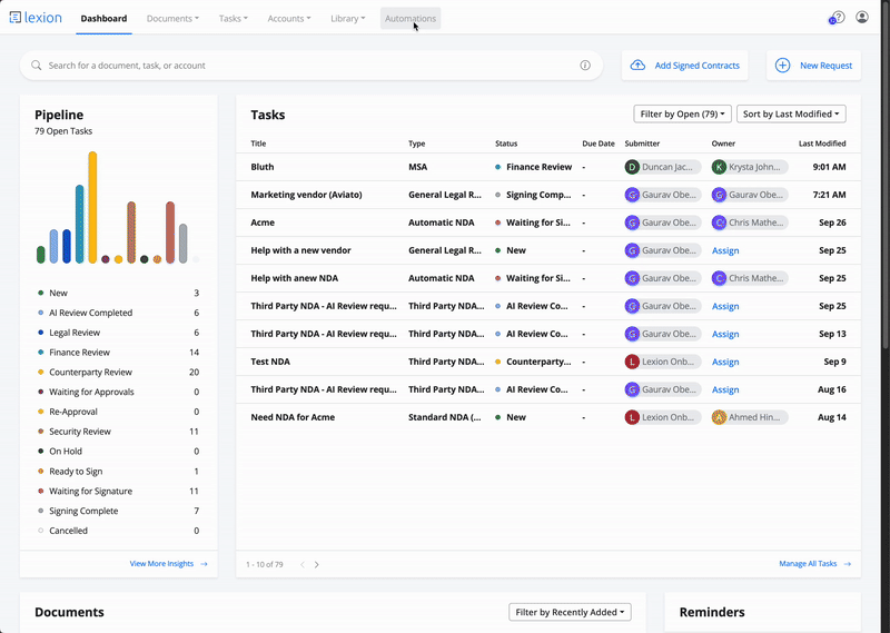 Lexion automations existed, but were fairly undiscoverable. During this initiative, we asked ourselves how could we make Automations a first class citizen at Lexion, and have it act as a true value prop of why Lexion is fast and easy to use, especially for new users. We began by surfacing a landing page and tab in the global navigation instead of having it be buried under multiple sub-menus. We also curated a library of commonly used automations, so an end user has less content to populate when building a workflow for the first time.