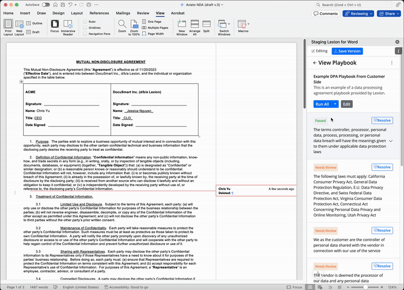 In 2024, AI agents gained popularity, especially in the legal space. Lexion used this market interest to launch our own AI agent called AI Contract Assist (AICA), which also had a free standalone version to attract new users. AICA allowed users to set guidelines for contract terms and evaluate contracts against these guidelines by suggesting edits and adding comments while explaining its recommendations.